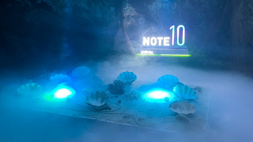 The entire cave was beautifully illuminated with flashy lights and laser light mapping that brilliantly evoked an outer space futuristic experience. The big unveil was  not just all fire-works, instead it was carefully set in one of the interlinking chambers, with the Note 10 display phones carefully seating on giant sea shells surrounded with mystical smoke.