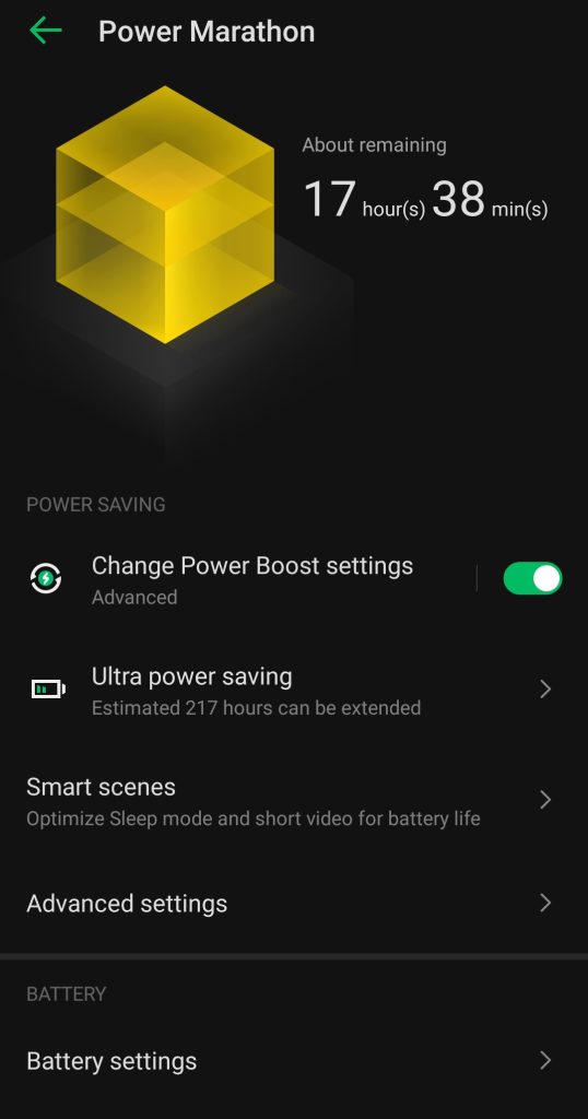 I’m averaging around two full days without charging the device. To extend the battery life further, the power boost plan can be activated in the battery settings. This will enable the dark theme, disable the vibrator and switch the refresh rate to 60Hz among other things.